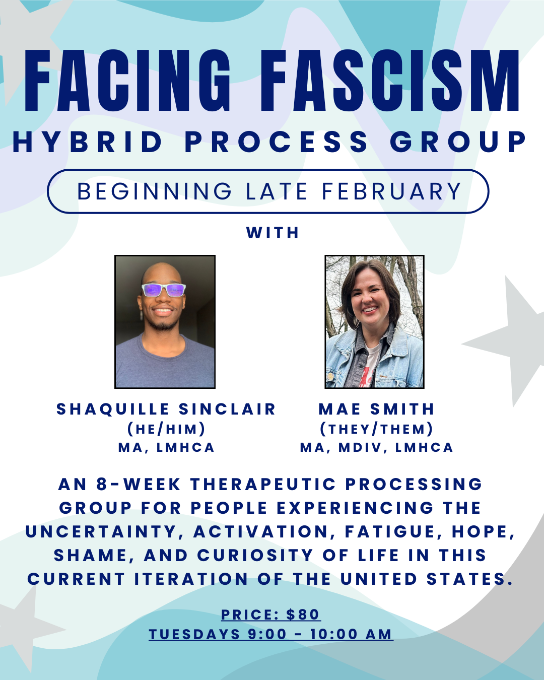 Facing Fascism is a therapeutic processing group for people experiencing the uncertainty, activation, fatigue, hope, shame, and curiosity of life in this current iteration of the United States. The group emphasizes not just processing what happens in our world around us, but also how it impacts our moment-to-moment experiences and the way we show up in relationships with others. How do we hold all that we are seeing, hearing, and feeling, as individuals and as a collective? How do we find a way through the difficulty of connecting across the breadth of our experiences? This group will provide a contained, therapeutic space to explore what emerges when we risk naming and facing the fullness of our selves in the realities of this time and place.